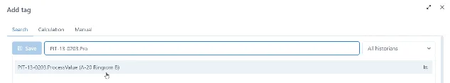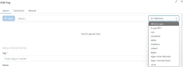 If searching for a tag within a specific historian, select a historian from a dropdown then search for and select a tag.
