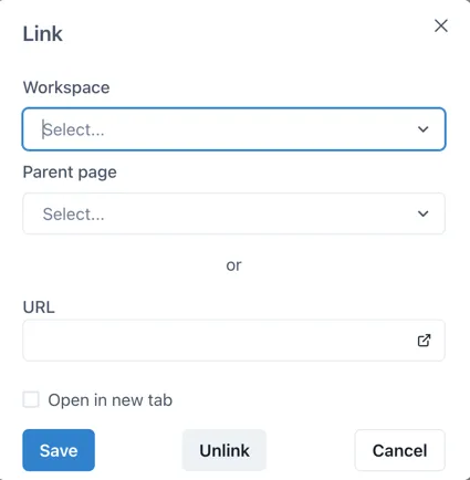 This will open the following window where you can select the Workspace and Page you wish to link it to within Ingenuity 7 or add a link to an external URL. If you wish to have the linked page open in a new tab, click on the checkbox “Open in a new tab”.